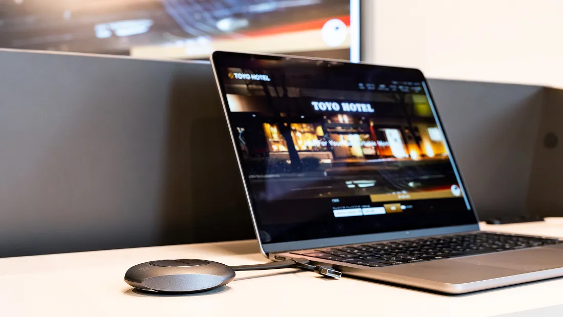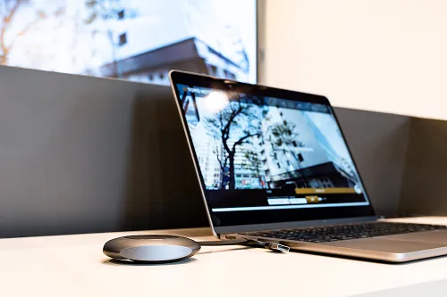 プレゼンテーション(ワイヤレスドングルを使うと、ボタンを押すだけでPC画面の投影が完了。投影画面はミーティングボード側からも、PC側からも操作可能です。)