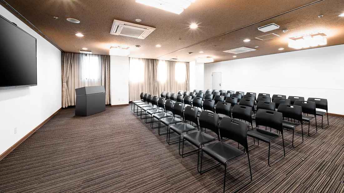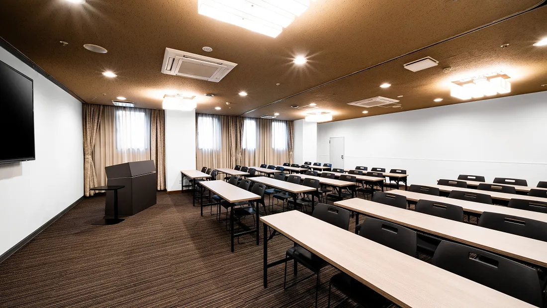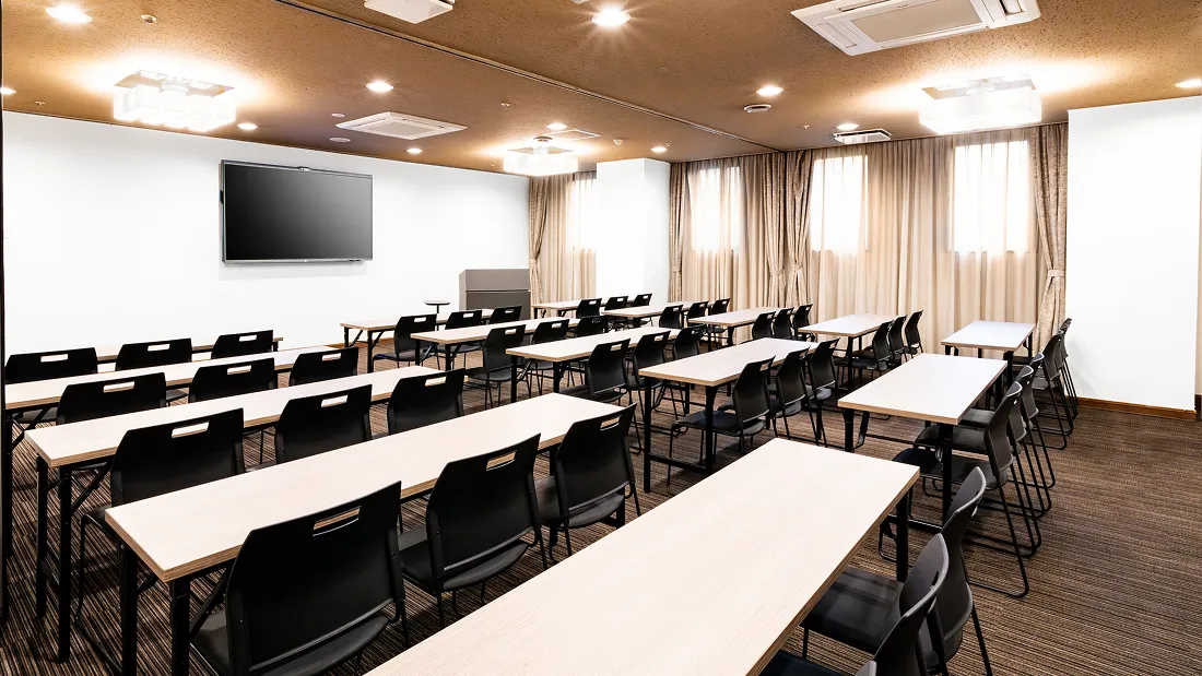 学校の教室と同じスタイルで、全ての席が前方に向いたレイアウトです。セミナー・研修・勉強会での利用が多く、PCや資料を広げての受講も快適です。